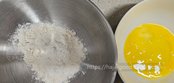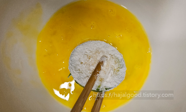 - 부침가루나 밀가루를 접시에 넓게 펴요