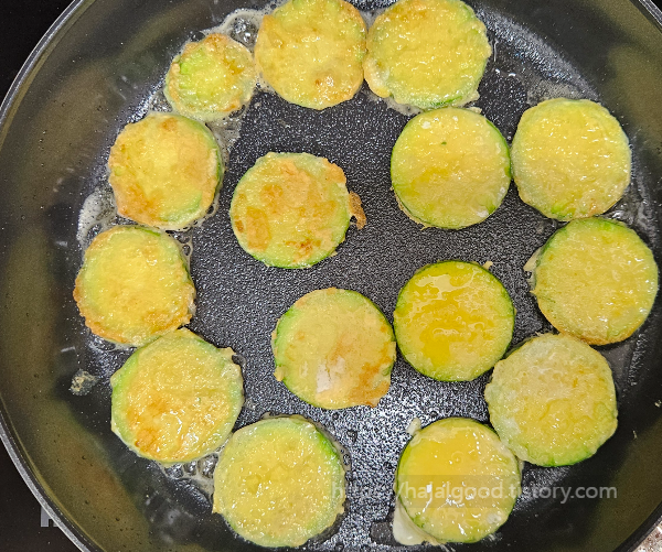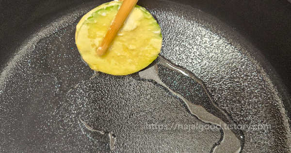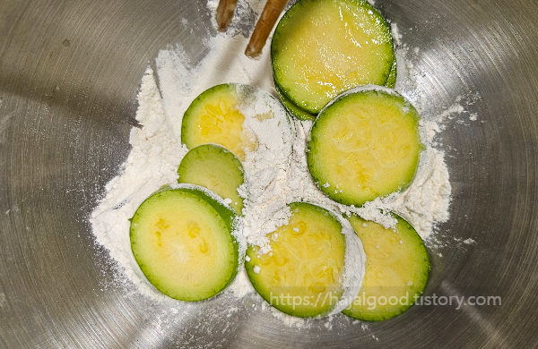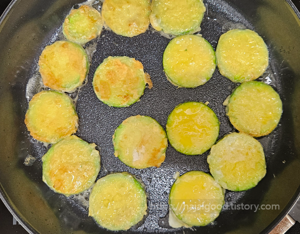 - 절인 호박을 먼저 밀가루 골고루 묻히고, 달걀물에 담갔다가 팬에 올려주세요