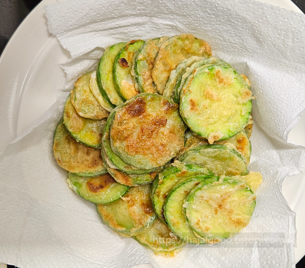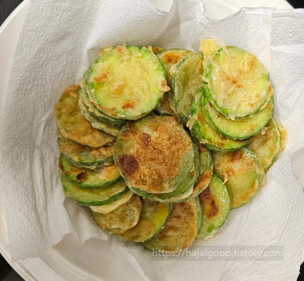 - 애호박을 깨끗이 씻고 양 끝을 자른 뒤, 0.5cm 두께로 동글 납작하게 썰어요