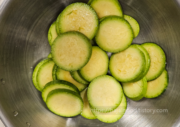 - 썰은 호박에 소금을 조금 뿌리고 5분 정도 절여요