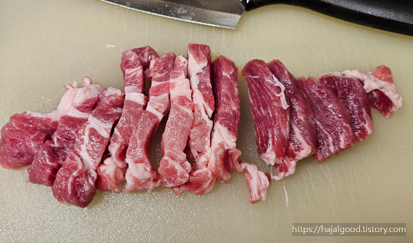 돼지고기는 찬물에 담궈 뒀다가 키친타올로 물기를 제거하고 먹기 좋은 크기로 썰어주세요