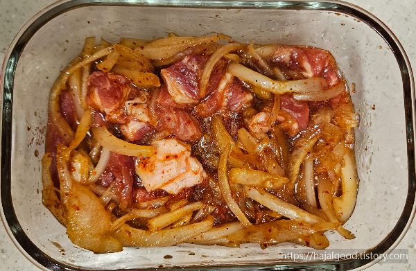돼지고기를 양념에 넣고 잘 버무린 후, 밀폐용기또는 지퍼백에 담아 냉장 또는 냉동 보관하세요